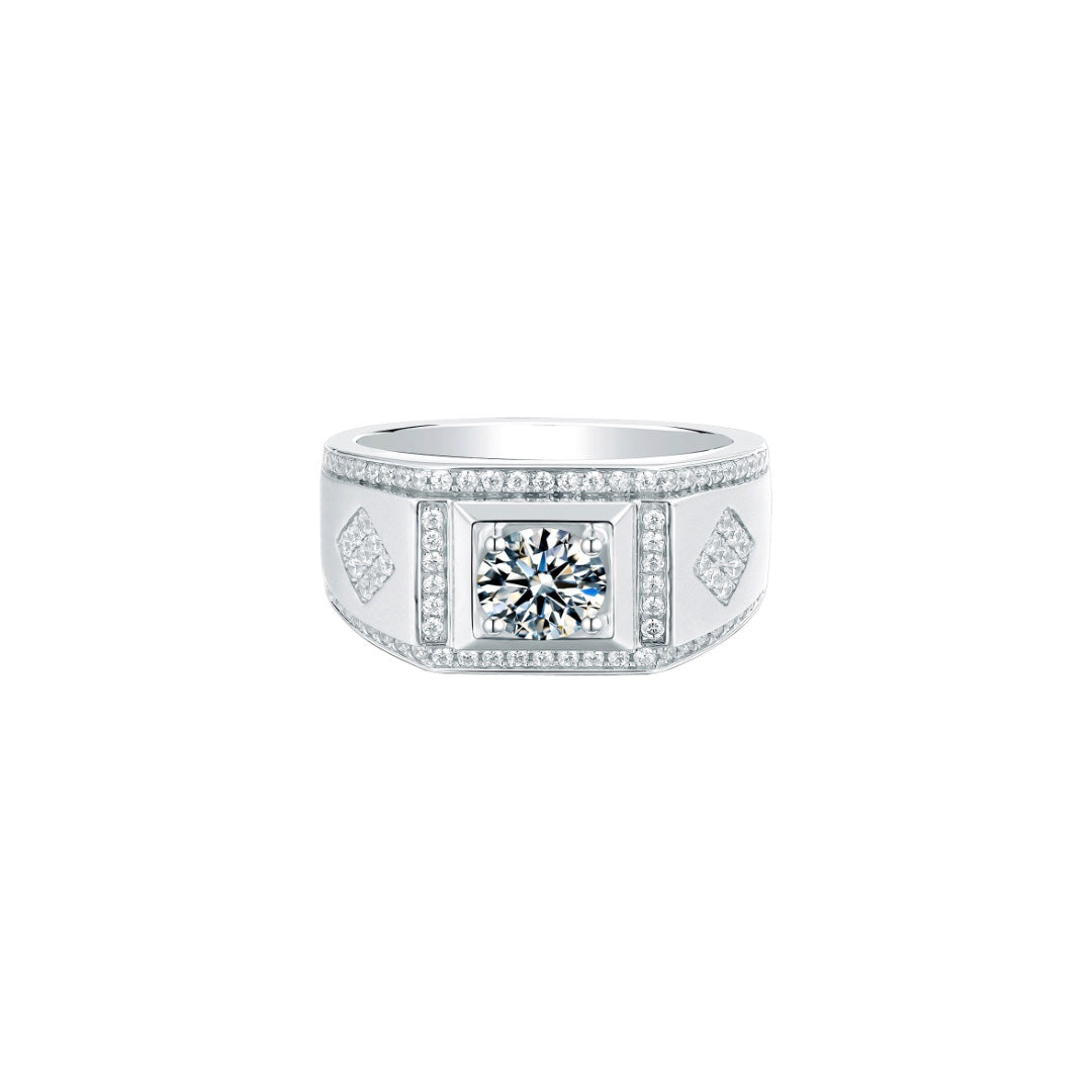 Defined by enduring style, the thick sterling silver band features an oval cut diamond simulant granting it a rather coordinated gleam. The uniform spacing of the diamond simulants and solid construction lend the ring a look of durability and class.